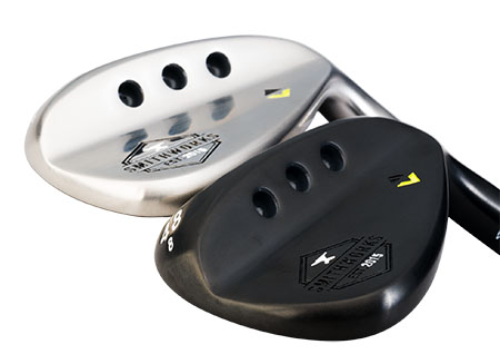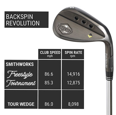 | Das einzigartige „x“ Muster zieht sich zusätzlich zu den Grooves (Rillen) über die gesamte Schlagfläche. Dies sorgt für optimierten Ballkontakt und kontinuierlichen Spin auf jeder Runde. Der Schlägerkopf verfügt zudem über einen Multi-Shot-Sohlenschliff, welcher das Spielen aus allen Lie-Winkeln ermöglicht. | Messungen haben ergeben das SmithWorks Wedges einen wesentlich höheren Spin als namhafte Tour Wedges erzeugen. Verglichen mit einem regulären Wedge ist dieser Unterschied jedoch noch wesentlich größer. | |